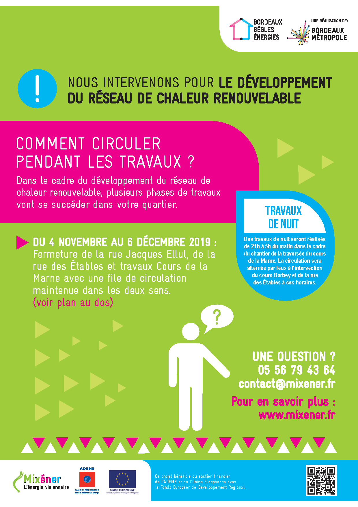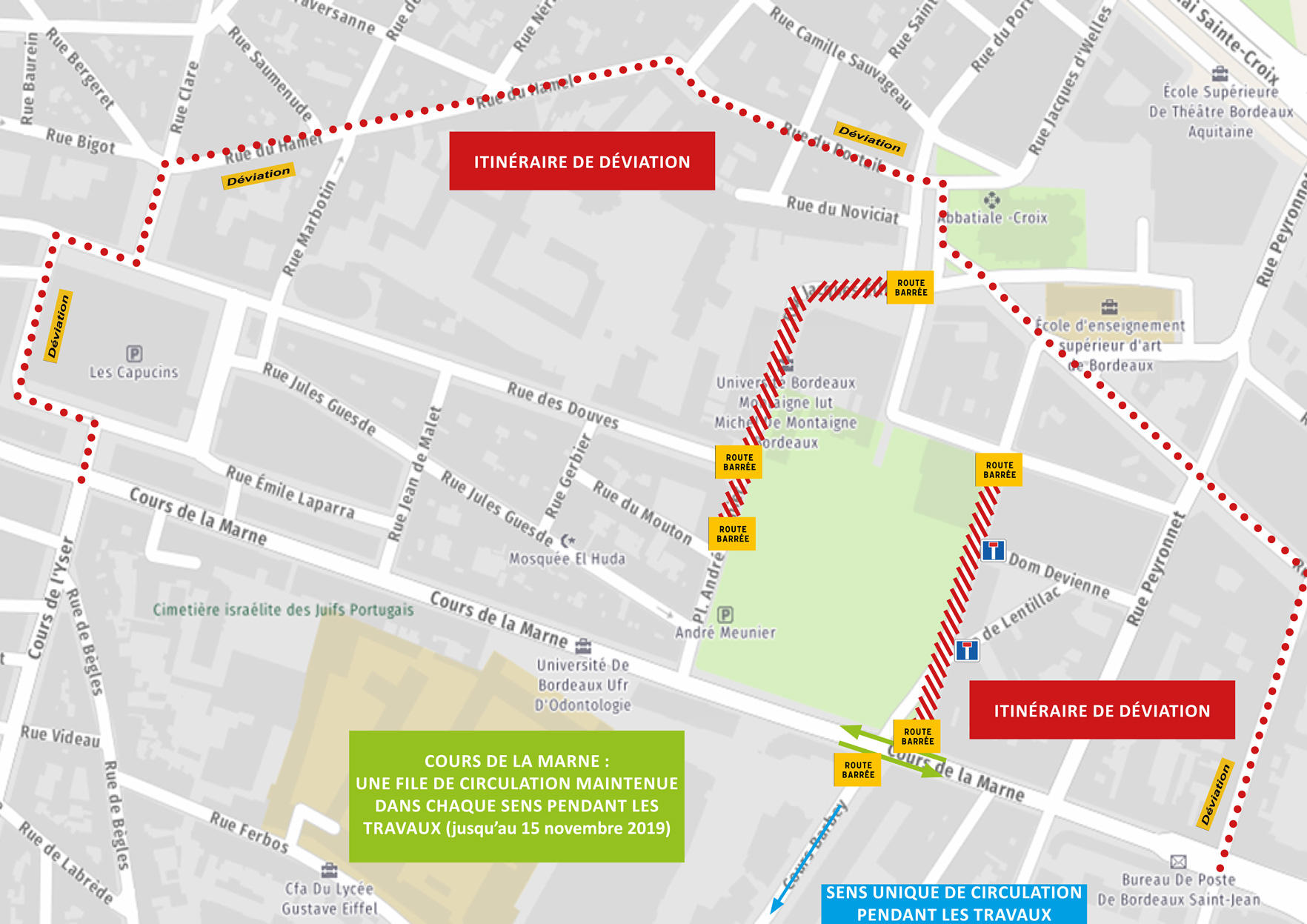 Fermeture de la rue Jacques Ellul, de la rue des Étables et travaux de la traversée du Cours de la Marne avec une file de circulation maintenue dans les deux sens.