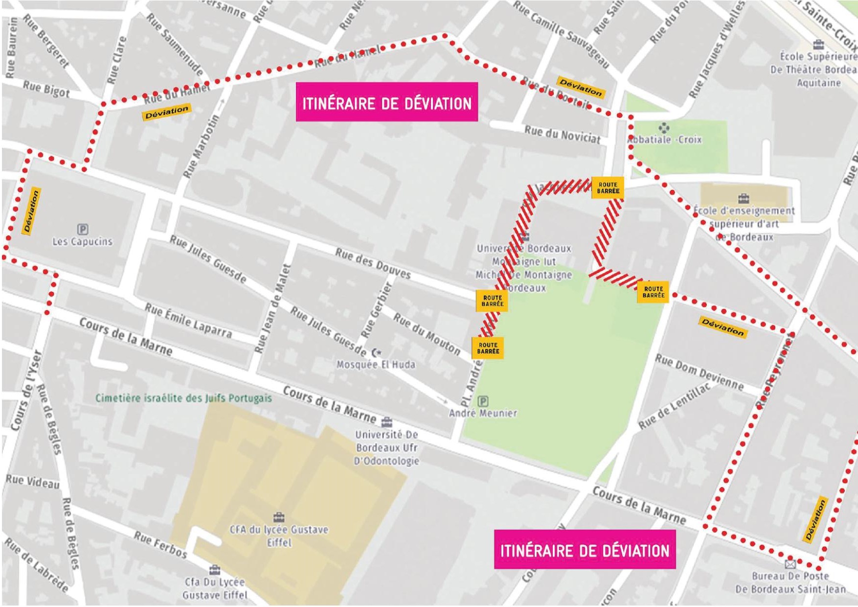 – Déviation par la rue Belle Étoile et la rue de Tauzia,